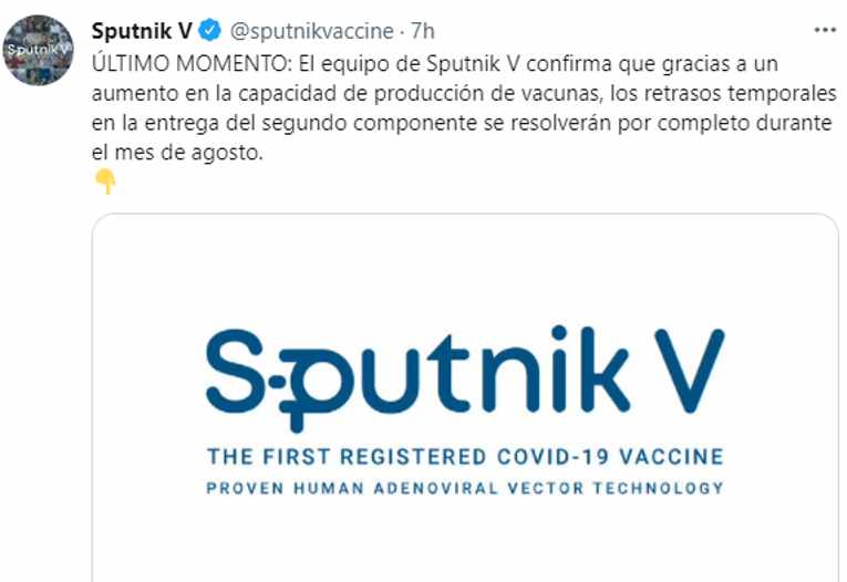 En la jornada de este miércoles 4 de agosto el equipo de Sputnik V confirmó que “en el mes de agosto se resolverán por completo todos los retrasos temporales en la entrega del segundo componente de la vacuna. Esto se debe al gran incremento en la capacidad de producción de las vacunas.”