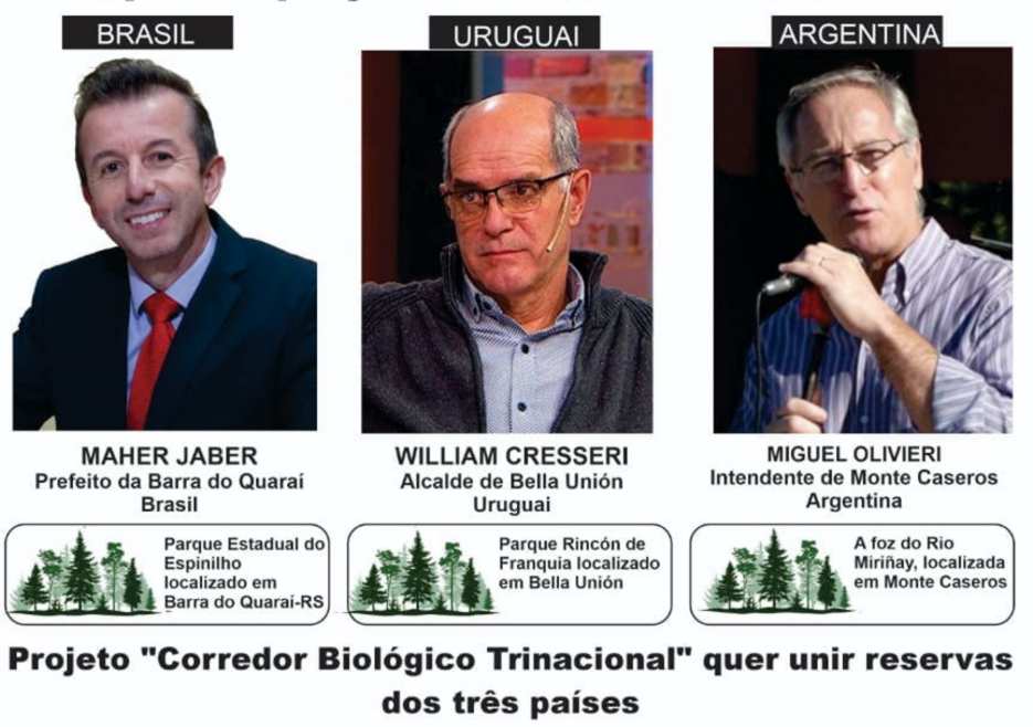Gobiernos Locales de la Triple Frontera representados por Miguel Olivieri, Intendente de Monte Caseros, Argentina, Maher Jaber Prefecto de Barra do Quaraí (Brasil), y William Casseri, alcalde de Bella Unión (Uruguay) expresaron su apoyo para con el Proyecto Ambiental de Corredor Biológico Trinacional propuesto por el Movimiento Transfronterizo ONGs, organización de la sociedad civil de los tres países que funciona desde 2005.