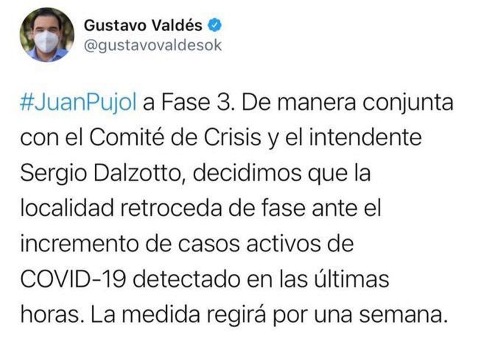 El gobernador Gustavo Valdés anunció vía Twitter que la localidad de Juan Pujol retrocederá a Fase 3 ante el incremento de casos positivos de Covid-19.