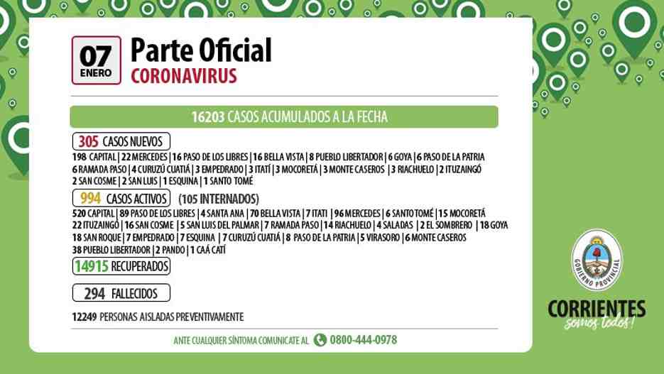 El informe epidemiológico dado a conocer por el Gobierno de Corrientes consigna que se registraron en las últimas 24 horas 305 contagios nuevos de Coronavirus de los cuales, 198 son personas que residen en Capital, 16 en Bella Vista, 4 en Curuzú Cuatiá 3 en Empedrado, 1 en Esquina, 6 en Goya, 3 en Itatí, 2 en Ituzaingó, 22 en Mercedes, 3 en Mocoretá, 3 en Monte Caseros, 6 en Paso de la Patria, 16 en Paso de los Libres, 6 en Ramada Paso, 3 en Riachuelo, 2 en San Cosme, 2 en San Luis del Palmar, 1 en Santo Tomé y 8 en Pueblo Libertador. Todos se encuentran aislados y cumpliendo el protocolo correspondiente. Se acumulan a la fecha 16203 contagios y se han recuperado 14916 personas que...
