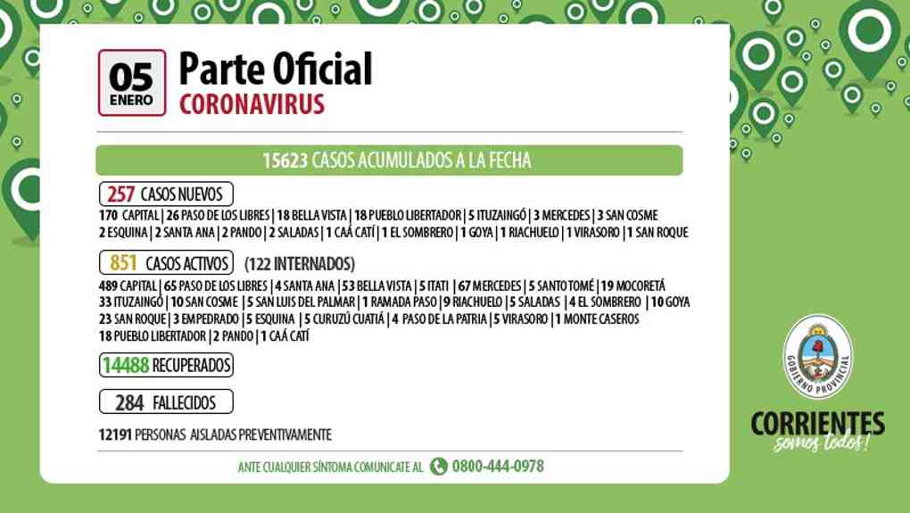 El informe epidemiológico de la Provincia da cuenta que en las últimas 24 horas se produjeron 257 nuevos casos de Coronavirus, de los cuales 170 corresponden a personas que residen en Capital, 1 en Goya, 18 e Bella Vista, 1 en Caa Catí, 1 en El Sombrero, 2 en Esquina, 5 en Ituzaingó, 3 en Mercedes, 26 en Paso de los Libres, 1 en Riachuelo, 3 en San Cosme, 2 en Santa Ana, 1 en Virasoro, 2 en Colonia Pando, 2 en Saladas, 1 en San Roque y 18 en Pueblo Libertador. Todos se encuentran aislados y cumpliendo el protocolo correspondiente. Se acumulan a la fecha 15623 contagios de los cuales se recuperaron 14488 personas que fueron dadas de alta