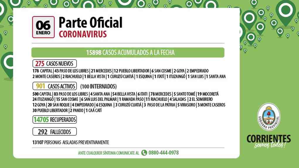 El informe epidemiológico de la Provincia dio cuenta que en las últimas 24 horas se produjeron 275 nuevos contagios de Coronavirus, de los cuales 178 son personas que residen en Capital, 1 en Bella Vista, 1 en Curuzú Cuatiá, 2 en Empedrado, 1 en Esquina, 2 en Goya, 1 en Itatí, 1 en Ituzaingó, 21 en Mercedes, 2 en Monte Caseros, 2 en Riachuelo, 6 en San Cosme, 1 en San Luis del Palmar, 1 en Santa Ana, 43 en Paso de los Libres y 12 en Pueblo Libertador. Todos se encuentran aislados y cumpliendo el protocolo correspondiente. Se acumulan a la fecha 15898 contagios de los cuales se recuperaron 14706 personas que fueron dadas de alta.