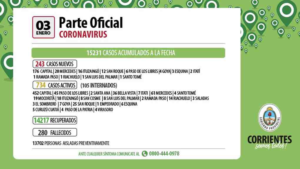 El parte epidemiológico de la Provincia consigna que en las últimas 24 horas se produjeron 243 contagios nuevos de Coronavirus, de los cuales 176 con personas que residen en Capital, 20 en Mercedes, 16 en Ituzaingó, 3 en Esquina, 12 en San Roque, 4 en Goya, 2 en Itatí, 6 en Paso de los Libres, 1 en Ramada Paso, 1 en Riachuelo, 1 en San Luis del Palmar y 1 en Santo Tomé. Todos se encuentran aislados y cumpliendo el protocolo correspondiente. Se acumulan a la fecha 15231 casos de los cuales se han recuperado 14217 personas que fueron dadas de alta.