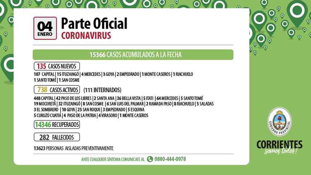 El Gobierno de Corrientes informó a través del parte oficial diario, que en las últimas 24 horas logró detectar 135 nuevos casos de coronavirus. Lo dio a conocer en el parte oficial de este lunes 4 de diciembre.