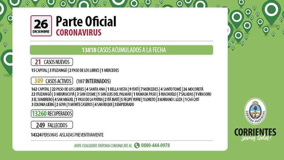 El informe epidemiológico de la Provincia consigna que en las últimas 24 horas se produjeron 21 casos nuevos de Coronavirus, de ellos 15 personas residen en Capital, 2 en Paso de los Libres, 1 en Mercedes y 3 en Ituzaingó, todos se encuentran aislados y cumpliendo el protocolo correspondiente. Se acumulan a la fecha 13818 contagios de los cuales se han recuperado 13260 personas que fueron dadas de alta.