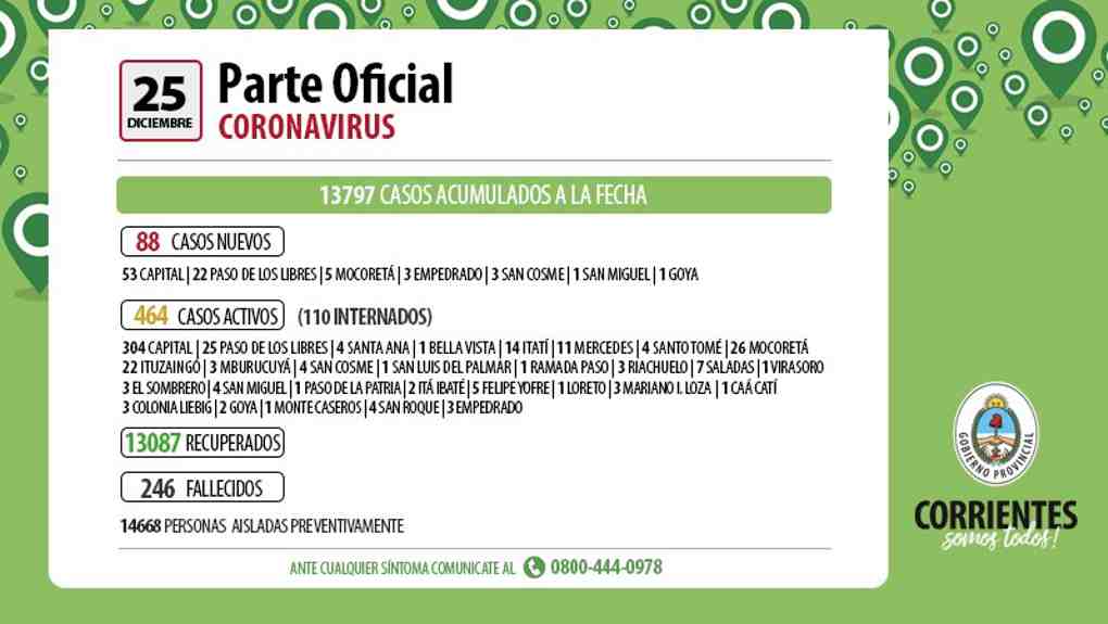 El informe epidemiológico de la Provincia consigna que en las últimas 24 horas se produjeron 88 nuevos casos de Coronavirus, de ellos 53 son personas que residen en Capital, 22 en Paso de los Libres, 1 en Goya, 5 en Mocoretá, 3 en Empedrado, 3 en San Cosme y 1 en San Miguel, todos se encuentran aislados y cumpliendo el protocolo correspondiente. Se acumulan a la fecha 13797 casos de los cuales se han recuperado y fueron dados de alta 13087 personas