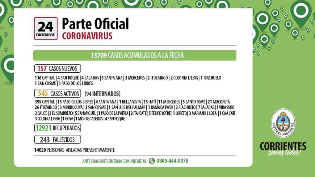 El parte epidemiológico de la Provincia muestra que en las últimas 24 horas se han producido 157 nuevos casos de Coronavirus en Corrientes, de los cuales 136 personas son residentes de Capital, 1 de Paso de los Libres, 3 de Mercedes, 2 de Ituzaingó, 1 de Riachuelo, 3 de Santa Ana, 1 de San Cosme, 4 de San Roque, 4 de Saladas y 2 de Colonia Liebig, todos se encuentran aislados y cumpliendo el protocolo correspondiente. Se acumulan a la fecha 13709 contagios, de los cuales se han recuperado 12921 personas que fueron dadas de alta.
