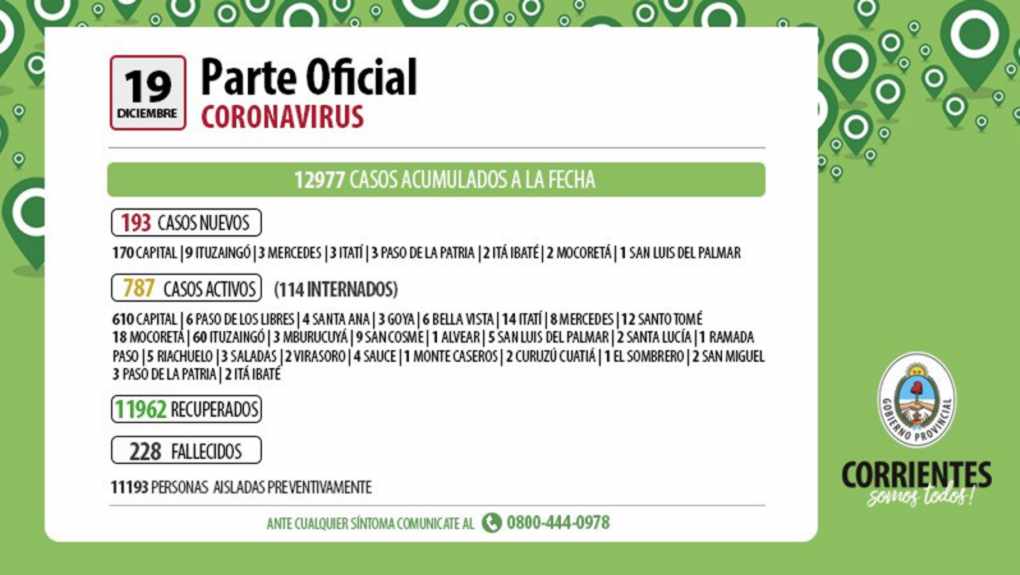 El parte epidemiológico de la Provincia consigna que en las ultimas 24 horas se han producido 193 nuevos contagios de Coronavirus, de ellos 170 residen en Capital, 9 en Ituzaingó, 3 en Mercedes, 3 en Itatí, 3 en Paso de la Patria, 2 en Itá Ibaté, 2 en Mocoretá y 1 en San Luis del Palmar. Todos se encuentran aislados y cumpliendo el protocolo correspondiente. Se han recuperado 11962 personas que fueron dadas de alta.