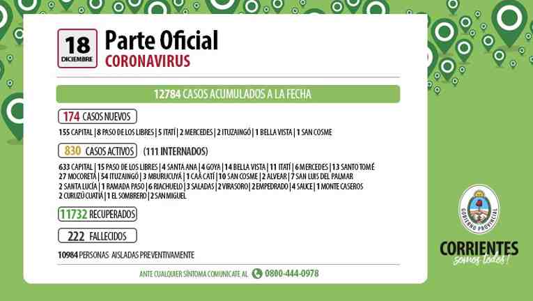El informe epidemiológico de la Provincia da cuenta que en las últimas 24 horas se produjeron en 174 nuevos contagios de Coronavirus, de ellos 155 son residentes de la Capital, 2 de Ituzaingó, 8 de Paso de los Libes, 2 de Mercedes, 5 de Itatí, 1 de Bella Vista y 1 de San Cosme. Todos se encuentran aislados y cumpliendo el protocolo correspondiente. Sw acumulan a la fecha 12784 casos de los cuales se recuperaron 11732 personas que fueron dadas de alta.