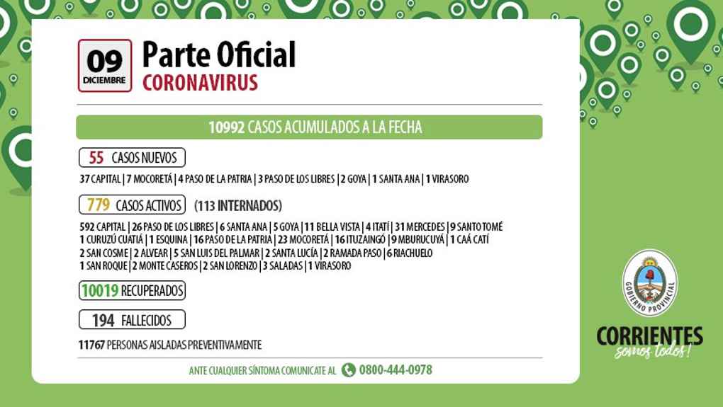 El parte epidemiológico de la Provincia consigna que en las últimas 24 horas se registraron 55 casos nuevos de Coronavirus, de ellos 37 corresponden a personas que residen en Capital, 2 de Goya, 7 de Mocoretá, 3 de Paso de los Libres, 4 de Paso de la Patria, 1 de Santa Ana, 1 de Virasoro, todos se encuentran aislados y cumpliendo el protocolo correspondiente. Se acumulan a la fecha 10992 casos, de los cuales se han recuperado 10019 personas que fueron dados de alta.