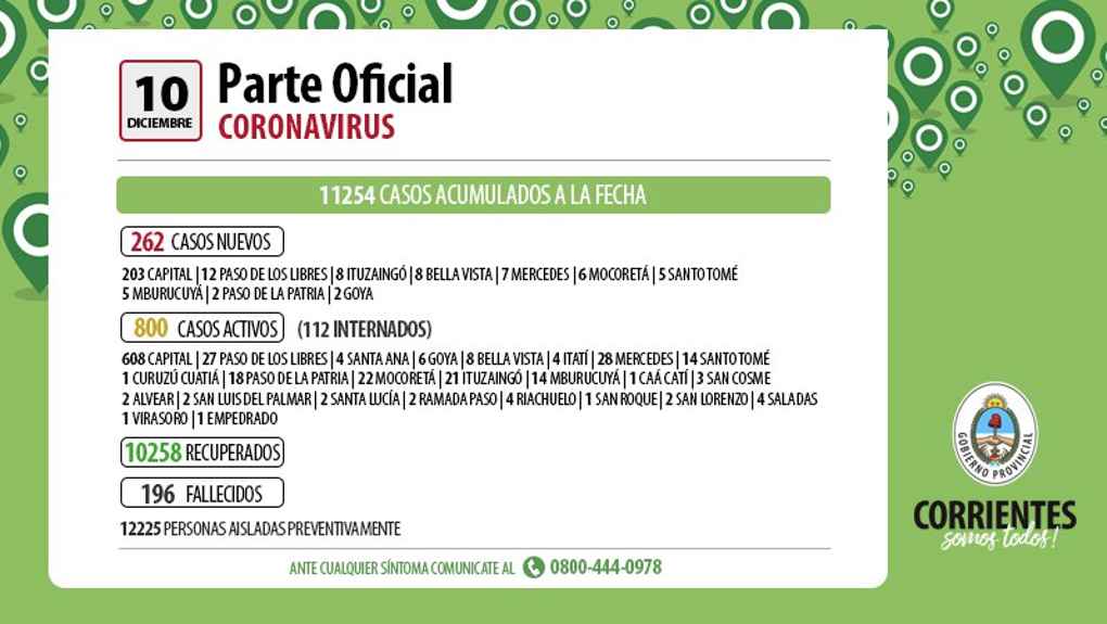 El Gobierno Provincial informó que en las últimas 24 horas se produjeron 262 nuevos contagios de Coronavirus, de ellos 203 personas son residentes en Capital, 2 en Goya, 7 en Mercedes, 12 en Paso de los Libres, 2 en Paso de la Patria, 1 en San Cosme, 5 en Santo Tomé, 5 en Mburucuyá, 1 en Empedrado, 8 en Ituzaingó, 1 en Saladas, 8 en Bella Vista, 1 en San Luis del Palmar y 6 en Mocoretá, todos se encuentran aislados y cumpliendo el protocolo correspondiente. Se acumulan a la fecha 11254 contagios de los cuales se han recuperado 10258 personas que fueron dadas de alta....