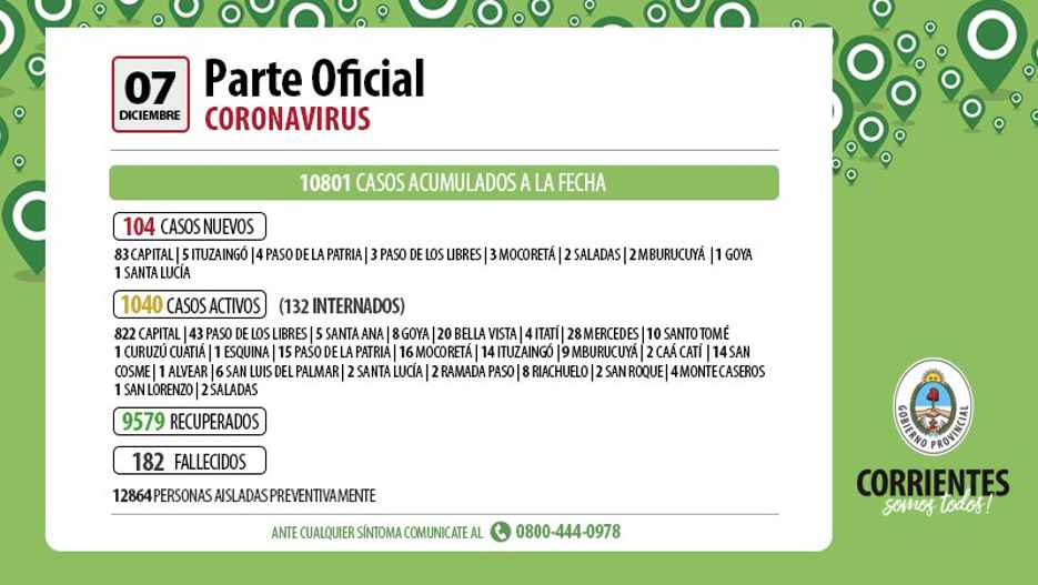 La provincia registró en las últimas 24 horas 104 nuevos contagios de Coronavirus, de ellos 83 personas son residentes en Capital, 2 de Mburucuyá, 2 de Saladas, 3 de Mocoretá, 1 de Goya, 3 de Paso de los Libres, 4 de Paso de la Patria, 5 Ituzaingó y 1 de Santa Lucia, todos se encuentran aislados y cumpliendo el protocolo correspondiente. Se acumulan a la fecha 10801 contagios de los cuales se han recuperado 9579 personas que fueron dadas de alta.