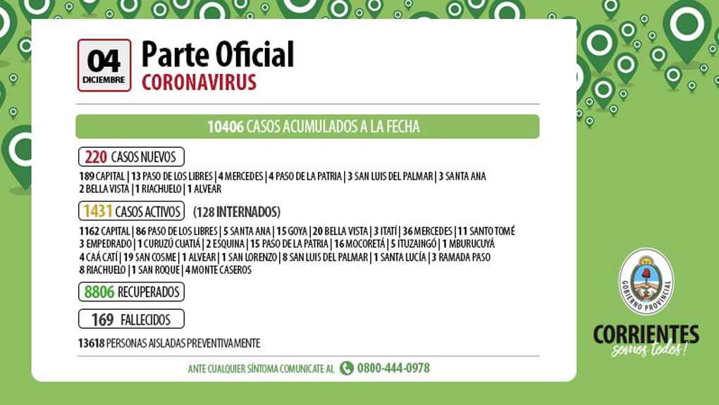La información epidemiológica de la Provincia revela que en las últimas 24 horas se produjeron 220 nuevos casos de Coronavirus, de los cuales 189 corresponden a personas que residen en Capital, 13 en Paso e los Libres, 4 en Mercedes, 1 en Riachuelo, 2 en Bella Vista, 3 en San Luis del Palmar, 3 en Santa Ana, 1 en Alvear y 4 en Paso de la Patria. Todos se encuentran aislados y cumpliendo el protocolo correspondiente. Se acumulan a la fecha 10406 contagios y se han recuperado 8806 personas que fueron dadas de alta.