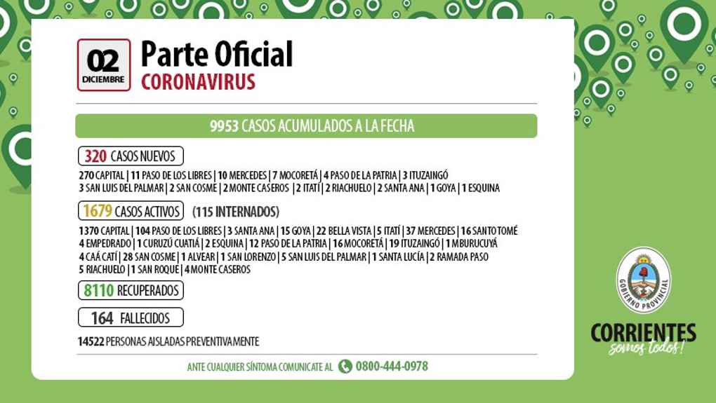 En las últimas 24 horas la Provincia registró 320 nuevos contagios de Coronavirus de los cuales 270 corresponden a personas que residen en Capital, 4 en Paso de la Patria, 11 en Paso de los Libres, 1 en Goya, 2 en San Cosme, 10 en Mercedes, 2 en Monte Caseros, 2 Riachuelo, 3 Ituzaingó, 1 Esquina, 2 Itatí, 7 Mocoretá, 2 Santa Ana y 3 San Luis del Palmar. Todos se encuentran aislados y cumpliendo el protocolo correspondiente. Se acumulan a la fecha 9953 casos de los cuales se han recuperado 8110 personas que fueron dadas de alta.