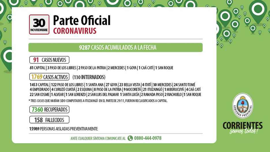 El parte epidemiológico de la fecha consignó que en las últimas 24 horas se produjeron 91 casos nuevos de Coronavirus en el territorio provincial, de ellos 81 son personas que residen en Capital, 2 en Paso de la Patria, 3 en Paso de los Libres, 1 en Goya, 1 en Caa Catí, 1 en San Roque y 2 en Mercedes, todos se encuentran aislados y cumpliendo el protocolo correspondiente. Se acumulan a la fecha 9287 de los que se han recuperado 7360 personas que fueron dados de alta.