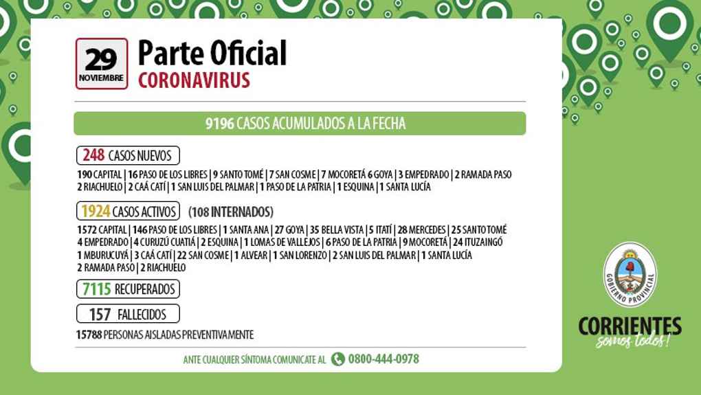 El parte epidemiológico de la Provincia muestra que hubo 248 casos nuevos de Coronavirus en las últimas 24 horas, de ellos 190 personas residen en Capital, 16 en Paso de los Libres, 1 en Paso de la Paria, 6 en Goya, 7 en San Cosme, 1 en San Luis del Palmar, 9 en Santo Tomé, 2 en Caa Catí, 1 Esquina, 2 Riachuelo, 2 Ramada Paso, 3 Empedrado, 7 de Mocoretá, 1 de Santa Lucia, todos se encuentran aislados y cumpliendo el protocolo correspondiente. Se acumulan a la fecha 9196 contagios, de los cuales se han recuperado 7115 personas que fueron dadas de alta.