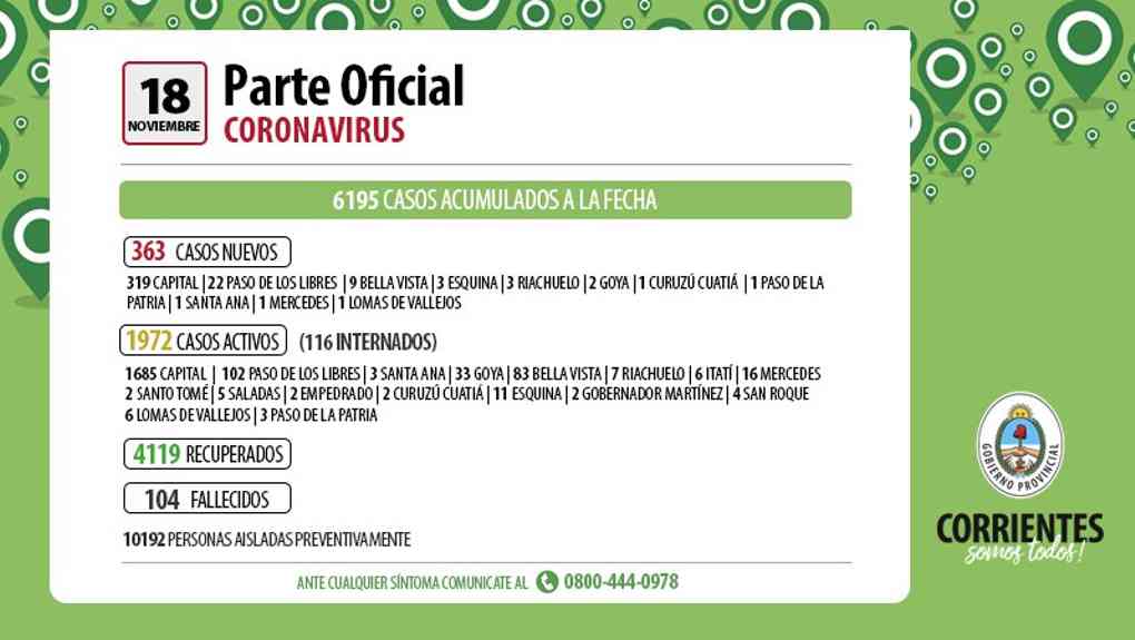 El parte epidemiológico de la Provincia dio cuenta que se han registrado en las últimas 24 horas 363 nuevos contagios de Coronavirus, de los cuales 319 personas residen en Capital, 22 de Paso de los Libres, 2 en Goya, 3 en Esquina, 9 de Bella Vista, 1 Santa Ana, 1 de Mercedes, 1 de Curuzú Cuatiá, 1 de Lomas de Vallejos, 3 de Riachuelo y 1 de Paso de la Patria, todos se encuentran aislados y cumpliendo con el protocolo correspondiente. Se acumulan a la fecha 6195 contagios de los cuales se han recuperado 4119 que fueron dados de alta. Se encuentran activos 1972 positivos, de los cuales 116 se encuentran internados en el hospital de Campaña, en condición clínica estable.<...