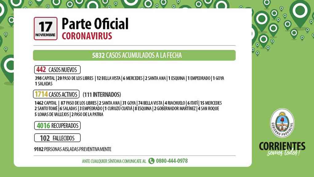 El parte epidemiológico de la Provincia, que en la fecha incorpora los resultados de la estrategia de búsqueda activa de los contagios de Covid-19, testeos en los barrios, arroja que se registraron 442 nuevos casos de Coronavirus, de los cuales 398 son personas que residen en Capital, 20 en Paso de los Libres, 12 Bella Vista, 6 Mercedes, 2 Santa Ana, 1 Esquina, 1 Empedrado 1 Goya y 1 Saladas. Todos se encuentran aislados y cumpliendo el protocolo correspondiente. Se acumulan a la fecha 5832 contagios y se han recuperado 4016 personas que fueron dadas de alta.