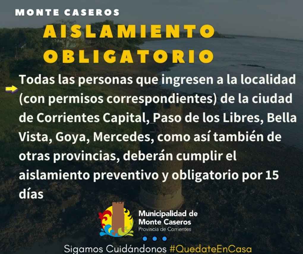 Todas aquellas las personas que ingresen a Monte Caseros, con el permiso correspondiente desde la capital de Corrientes, Paso de los Libres, Bella Vista, Goya, Mercedes, como así también de otras provincias, deberán cumplir con el aislamiento preventivo y obligatorio. Quienes cuenten con hisopado NEGATIVO sólo cumplirán 10 días d...