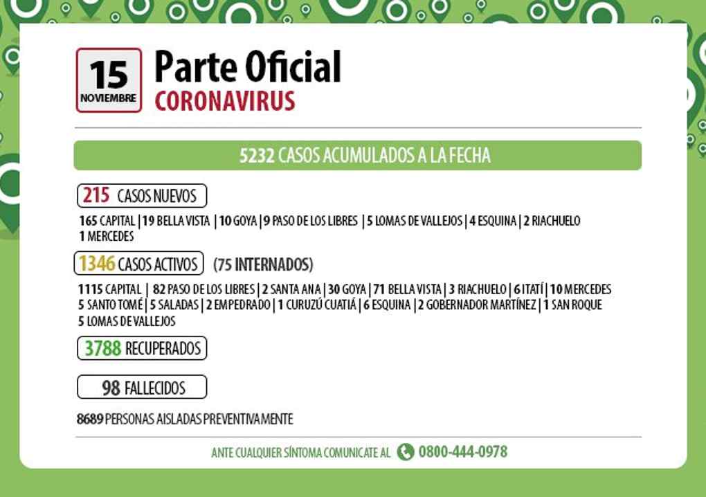 215 casos positivos nuevos, 165 de estas personas residen en Capital, cuyo origen de contagio provino de contacto estrecho con positivos locales, 10 de Goya cuyo nexo de contagio corresponde a contacto estrecho con un positivo de la localidad, 9 de Paso de los Libres, provenientes de contacto estrecho con un positivo de la localidad, 19 de Bella Vista originado por contacto estrecho con positivos de la localidad, 1 de Mercedes provenientes de contacto estrecho con positivo de la localidad, 2 de Riachuelo originados en contacto estrecho con positivo local, 4 de Esquina proveniente por contacto con positivo de la localidad y 5 de Lomas de Vallejo...