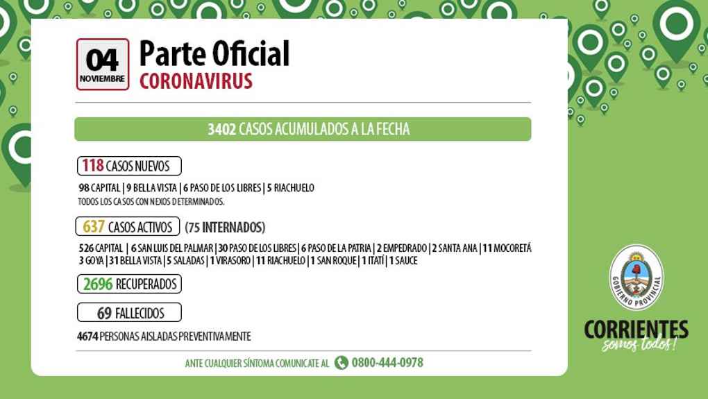 El parte epidemiológico de la Provincia dio cuenta que en las últimas 24 horas se produjeron 118 nuevos casos positivos de Coronavirus, de los cuales 98 corresponden a personas que residen en Capital, 6 en Paso de los Libres, 5 Riachuelo y 9 en Bella Vista. Se acumulan a la fecha 3402 contagios, de los cuales se han recuperado 2696 personas que fueron dadas de alta.