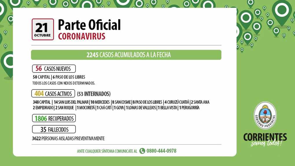 Los casos activos de Covid19 son 404 en toda la provincia, de los cuales 348 corresponden a la ciudad Capital, 10 en Mercedes, 14 en San Luis del Palmar, 8 en San Cosme, 4 en Curuzú Cuatiá, 2 en Santa Ana, 2 Empedrado, 2 San Roque, 8 en Paso de los Libres y 1 en Mocoretá, 1 en Caá Catí, 1 Goya, 1 Lomas de Vallejos, 1 Bella Vista y 1 en Perugorria.