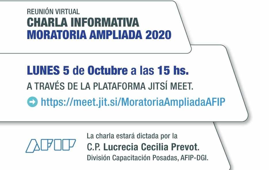 a todos sus asociados y público en general, a una charla informativa que se llevará a cabo de manera virtual el día 5 de octubre a las 15.00 horas, en la cual se tratará los detalles del reglamento y funcionamiento de la "Moratoria Ampliada 2.020" establecida por la A.F.I.P."
