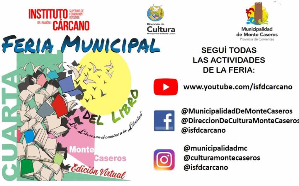La Municipalidad de Monte Caseros – a través de la Dirección de Cultura y el Instituto Superior de Formación Docente Dr. Ramón J. Cárcano – da inicio este lunes 5 de octubre y en coincidencia con el Aniversario de nuestra localidad la 4ta edición de la Feria Municipal del Libro, la que este año será de modalidad virtual. Bajo el lema “Los libros son el camino de la libertad” se realizará hasta el miércoles 7 a través de las plataformas @MunicipalidadDeMonteCasero, @DireccionDeCulturaMonteCaseros, @isfedecarcano, www.youtube.com/isfedecarcano.