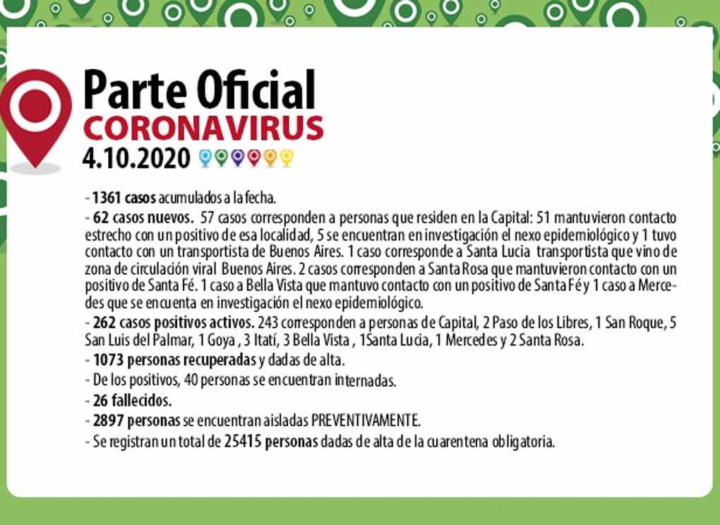 El informe epidemiológico de la Provincia consigna que en las últimas 24 horas se registraron 62 nuevos casos, de los cuales 57 corresponden a Capital, 1 a Bella Vista 2 a Santa Rosa, 1 Mercedes y 1 a Santa Lucía, de esta manera se acumulan a la fecha 1361 contagios, de los cuales se han recuperado 1073 personas que fueron dadas de alta. Están activos 262 positivos de los cuales 40 se encuentran internados en el hospital de Campaña en condición clínica estable. De los positivos activos 243 corresponden a Capital, 1 a Goya, 1 San Roque, 2 a Paso de los Libres, 5 a San Luis del Palmar, 3 a Itatí, 3 Bella Vista, 2 Santa Rosa, 1 Santa Lucia y 1 Mercedes. Han fallecido a la fecha 26 per...