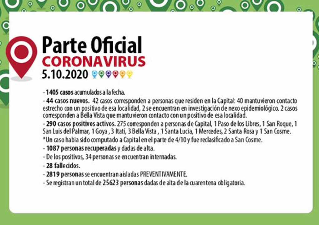 El parte epidemiológico de la Provincia da cuenta que en las últimas 24 horas fueron 44 los contagios nuevos de Coronavirus, de los cuales 42 corresponden a personas que residen en Capital y 2 en Bella Vista, todos se encuentran aislados y cumpliendo el protocolo correspondiente. De esta manera se acumulan a la fecha 1405 casos, de los cuales se recuperaron 1087 personas que fueron dadas de alta. Están activos 290 positivos, de los cuales 34 se encuentran internados en el Hospital Escuela, en condición clínica estable. Los positivos activos 275 corresponden a Capital, 1 a Goya, San Roque 1, Paso de los Libres 1, San Luis del Palmar 1, Itatí 3, Bella Vista 6, Santa Rosa, Santa Lucia...