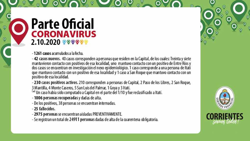 El Gobierno Provincial informó este viernes que el parte epidemiológico de la fecha dio cuenta de 42 nuevos contagios de Coronavirus, de los cuales 40 corresponden a personas que residen en Capital, 1 en Itatí y 1 en San Roque. De esta manera se acumulan a fecha 12161 contagios de los cuales se han recuperado 1008 personas. Se encuentran activos 230 positivos, de los cuales 38 están internados en el hospital de Campaña en condición clínica estable. De los positivos activos 210 corresponden a Capital, 1 a Goya, 2 San Roque, 2 Paso de los Libres, 3 Mantilla, 4 Monte Caseros, 5 San Luis del Palmar y 3 de Itatí. Han fallecido a la fecha 25 personas, 21 de Capital 1 de Paso de los Libre...