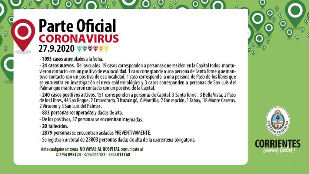 El parte epidemiológico de la fecha consigna que, en las últimas 24 horas, se produjeron en el territorio provincial 24 nuevos casos de Coronavirus, de los cuales 19 corresponden a personas que residen en Capital, 1 de Santo Tomé, 1 de Paso de los Libres y 3 de San Luis del Palmar. De esta forma se acumulan a la fecha 1093 contagios, de los cuales se han recuperado 833 personas que fueron dadas de alta. Hay 240 positivos activos de los cuales 37 se encuentran internados en el hospital de Campaña, en condición clínica estable.