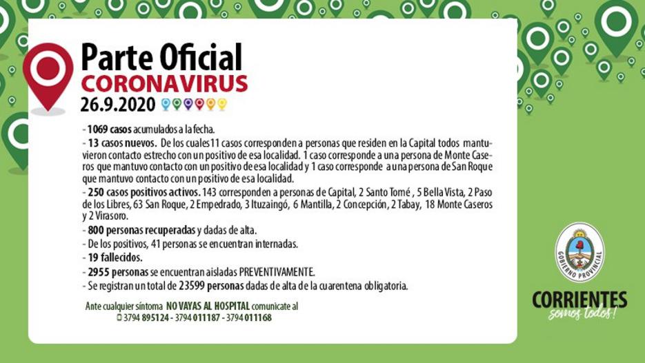 El informe de la situación epidemiológica de la Provincia, indica que en las últimas 24 horas se han producido 13 nuevos contagios de Coronavirus, 13 de estas personas son residentes de la Capital, 1 de San Roque y 1 de Monte Caseros, de esta manera se acumulan a la fecha 1069 contagios, de los cuales se han recuperado 800 personas que fueron dadas de alta. Se encuentran activos 250 positivos de los cuales 41 se encuentran internados en el hospital de Campaña en condición clínica estable. De los positivos activos 143 corresponden a Capital, 2 Santo Tomé, 5 Bella Vista, 2 Paso de los Libres, 63 San Roque, 2 Empedrado 3 Ituzaingó, 6 Mantilla, 2 Concepción, 2 Tabay, 18 Monte Caseros y...
