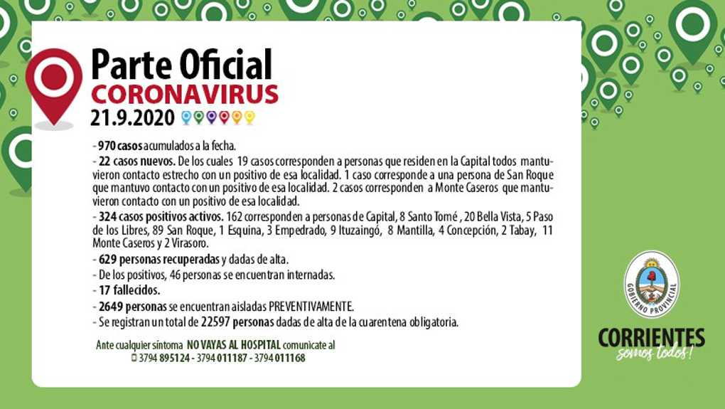 El Gobierno Provincial informó que durante las últimas 24 horas se produjeron 22 nuevos contagios de Coronavirus, de ellos 19 corresponden a personas que residen en Capital, 1 en San Roque y 2 de Monte Caseros. De esta corma se acumulan a la fecha 970 contagios de los cuales se han recuperado 629 personas que fueron dadas de alta, están activos 324 positivos de los cuales 46 personas se encuentran internadas en el hospital de Campaña en condición clínica estable.