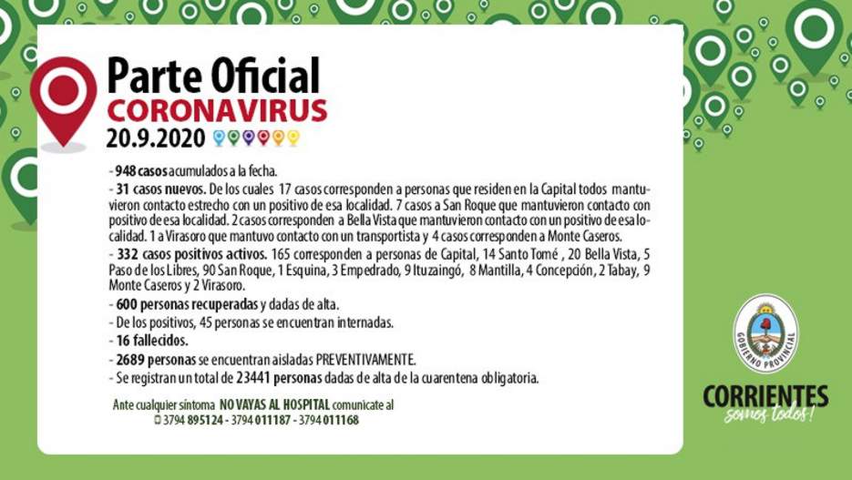 La información epidemiológica de Corrientes, da cuenta que en las últimas 24 horas, se registraron 31 contagios de Coronavirus, de los cuales 17 son personas que residen en Capital, 7 en la localidad de San Roque, 2 de Bella Vista, 1 a Virasoro y 4 personas que residen en Monte Caseros. De esta forma se acumulan a la fecha 948 casos positivos, de los cuales se han recuperado 600 personas que fueron dadas de alta. Se encuentran activos 332 casos, de los cuales 45 se encuentran internados en el hospital de Campaña en condición clínica estable. De los positivos activos 165 corresponden a Capital, 14 a Santo Tomé, 20 Bella Vista, 5 Paso de los Libres, 90 San Roque, 1 Esquina, 3 Empedra...