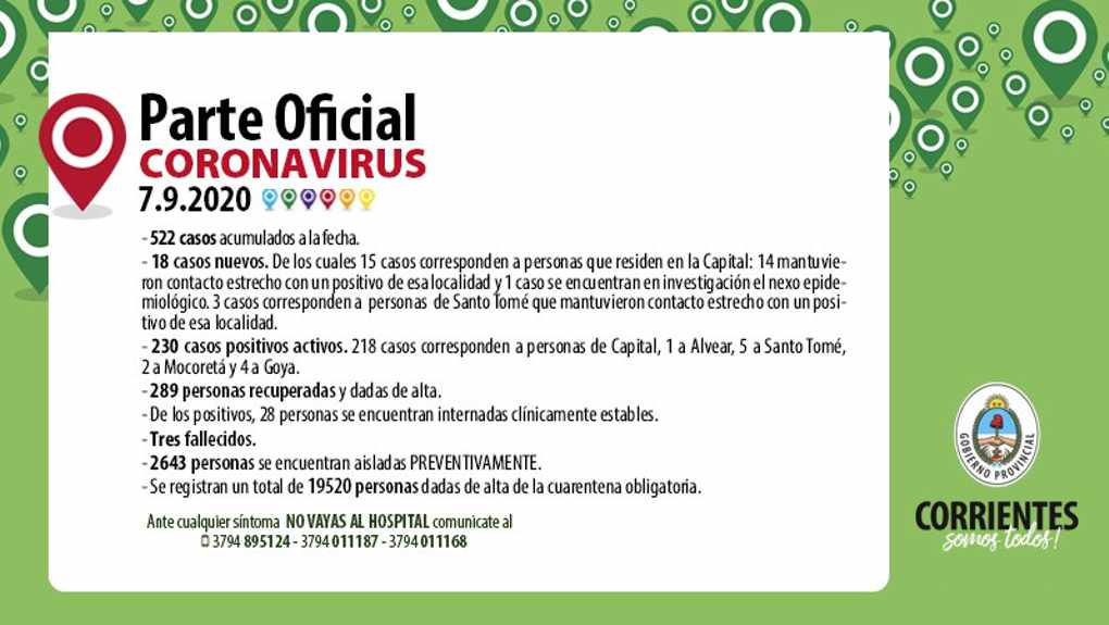 El informe epidemiológico de la provincia consigna que, en las últimas 24 horas, se registraron 33 contagios nuevos de Coronavirus, de los cuales 31 corresponden a la ciudad Capital, 28 de ellos provienen de contacto estrecho con positivos locales, mientras tres personas el nexo epidemiológico se encuentra en estudio, los otros dos contagiados son residentes en Santo Tome, que tuvieron contacto estrecho con transportista que viajó a Mendoza, zona de alta circulación del virus. De esta forma se acumulan a la fecha 504 positivos, de los cuales se recuperaron 280 personas que fueron dadas de alta.