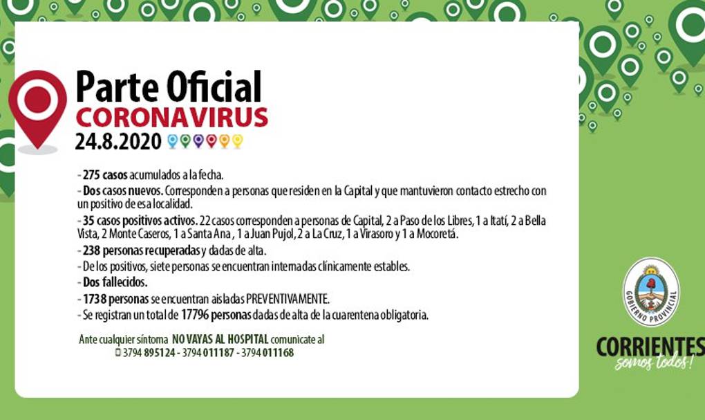 En mismo da cuenta que a la fecha los positivos se mantienen en 2 (uno de Monte Caseros y el otro de Juan Pujol pero se recupera en la ciudad). No hay casos nuevos ni sospechosos....