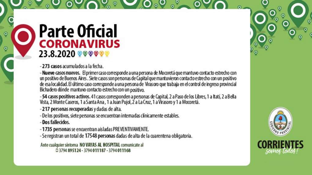 El informe epidemiológico arrojó nueve casos nuevos de Coronavirus en territorio provincial, siete corresponden a Capital que provienen de contacto estrecho con positivos locales, una persona que trabaja en el acceso a la Provincia en paraje Bichadero donde mantuvo contacto con un positivo, y por último una persona de Mocoretá que mantuvo contacto estrecho con un positivo de Buenos Aires. Se acumulan a la fecha 273 contagios, de los cuales se han recuperado 217. Continúan activos cincuenta y cuatro positivos, de los cuales siete se encuentran internados en el hospital de Campaña. Los activos 41 so de Capital, dos de Paso de los Libres, uno de Itatí, dos de Bella Vista, 2 de Monte ...