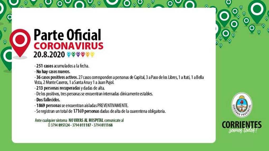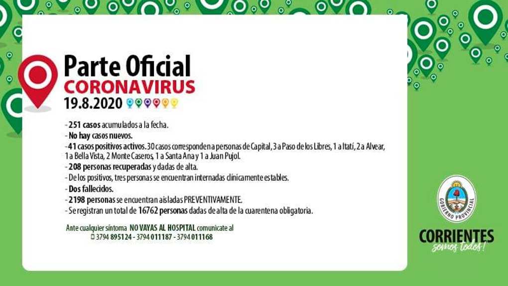 El parte epidemiológico dio cuenta nuevamente que por tercer día consecutivo no hubo nuevos contagios de Coronavirus en el territorio correntino, pasando a ser la novedad más importante el crecimiento del número de recuperados a 208. Los contagios acumulados a la fecha son 251, de los cuales se recuperaron 208 personas que fueron dadas de alta.