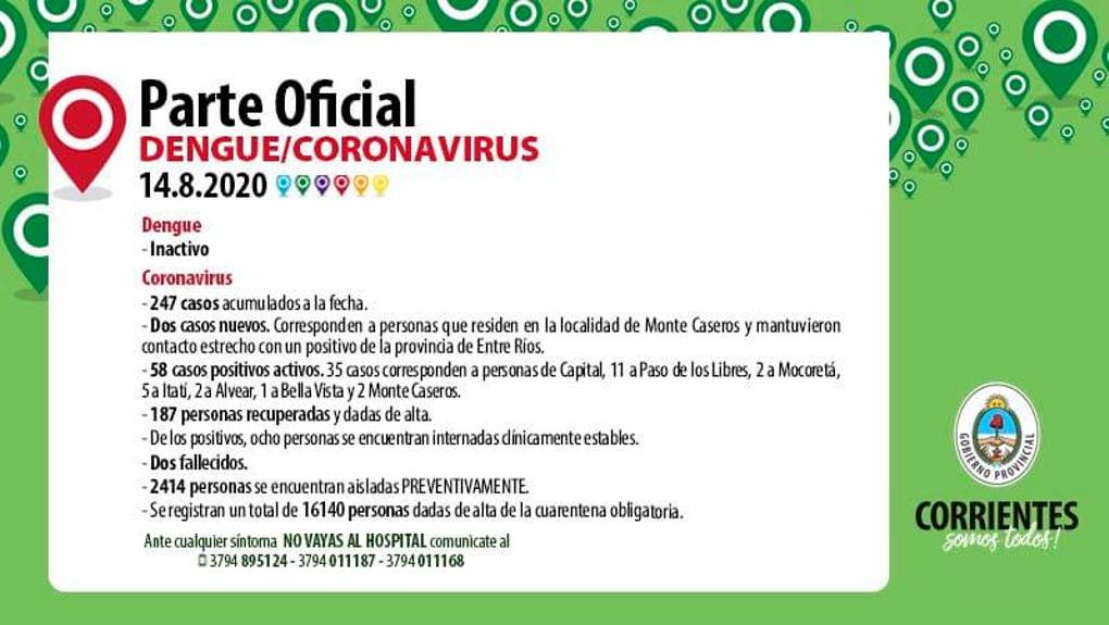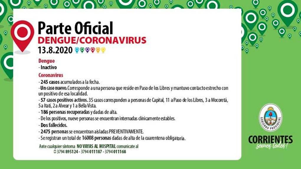 A la fecha se acumulan 245 casos positivos de los cuales 186 se han recuperado y fueron dados de alta. Hay 57 casos activos, de los cuales 9 están internados en el Hospital de Campaña. Capital tiene 35 activos, Libres 11, Mocoretá 3, Itatí 5, Alvear 2 y Bella Vista 1. A la fecha han fallecido 2 personas, una de Capital y ...
