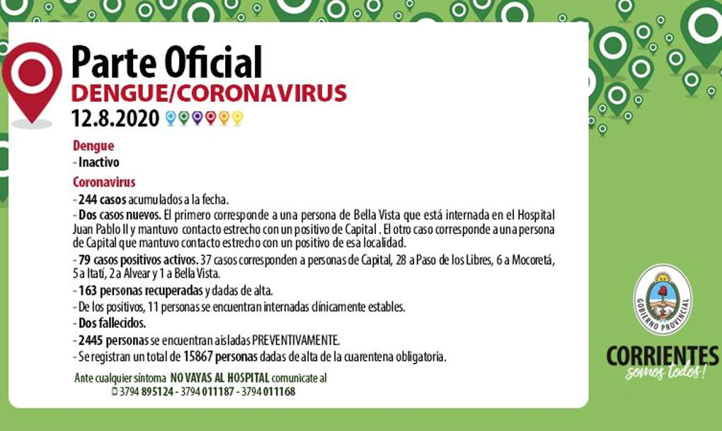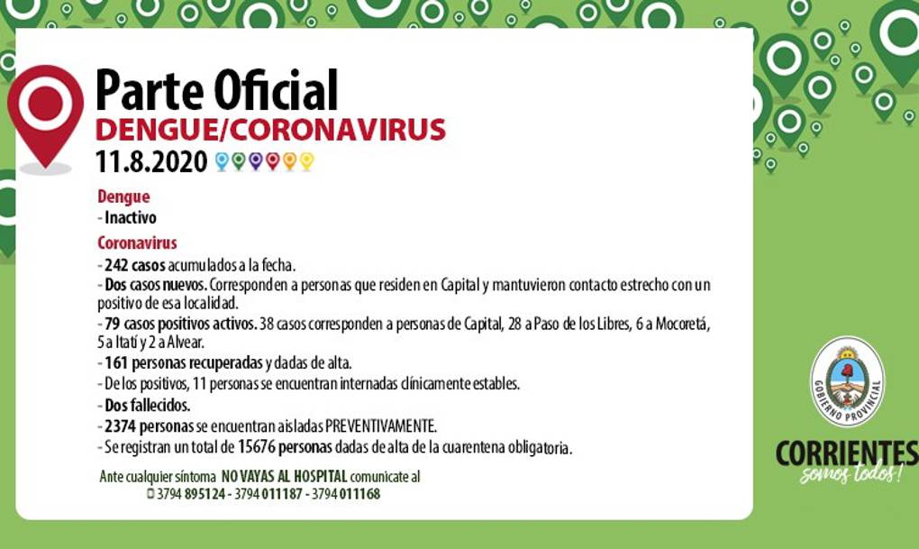 Mediante un parte oficial emitido por la Dirección del Hospital Samuel W Robinson se informó la situación epidemiológica de coronavirus/ dengue de la ciudad de Monte Caseros correspondiente al día de la fecha: martes 11 de agosto de 2020.