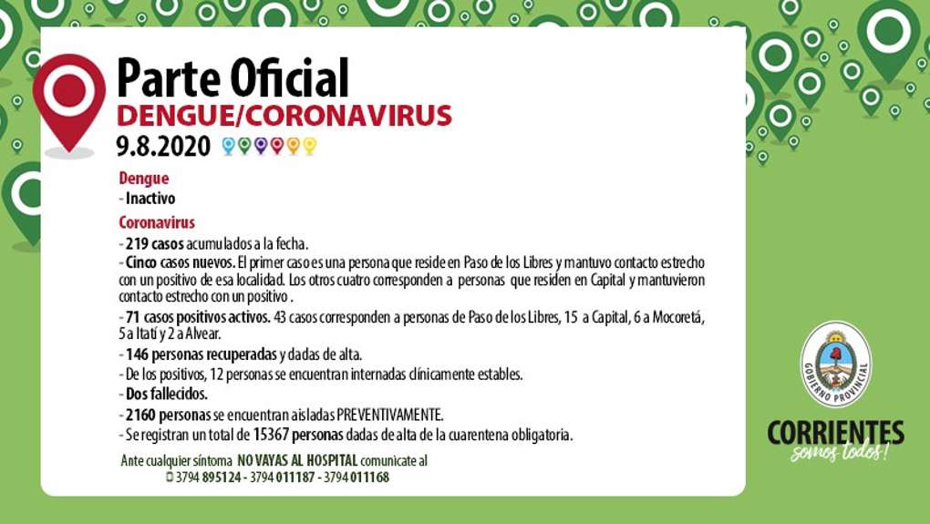 A la fecha han fallecido dos personas una de Capital y una de Paso de los Libres, se encuentran en aislamiento preventivo obligatorio 2185 personas, han conclui...