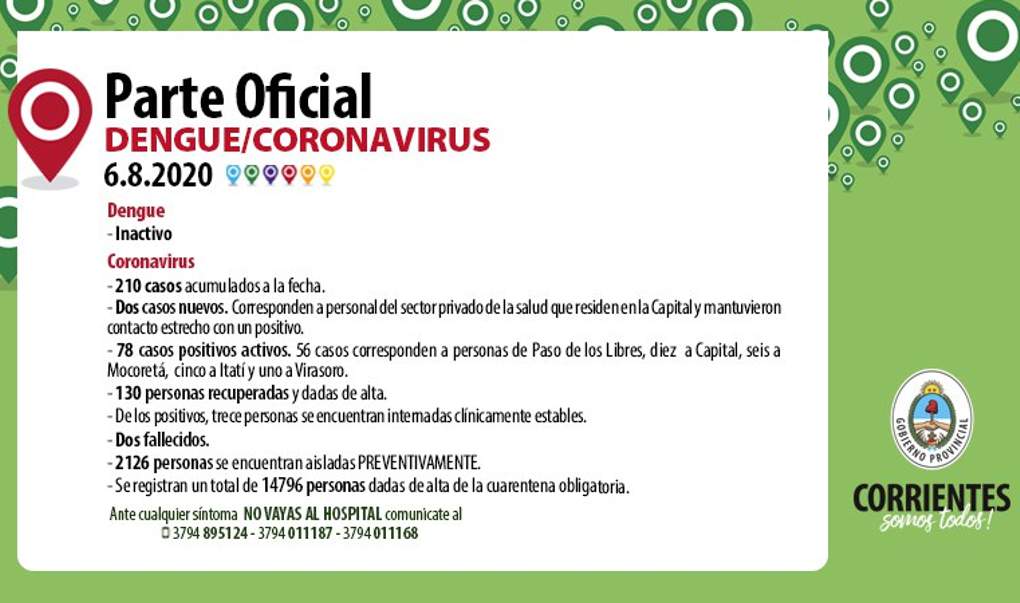 De esta manera se acumulan a la fecha 210 casos positivos, de las cuales se recuperaron 130 personas que fueron dadas de alta. Hay 78 positivos activos de ellos trece se encuentran internados en el Hospital de Campaña, diez de Paso de los Libres y tres de Capital....