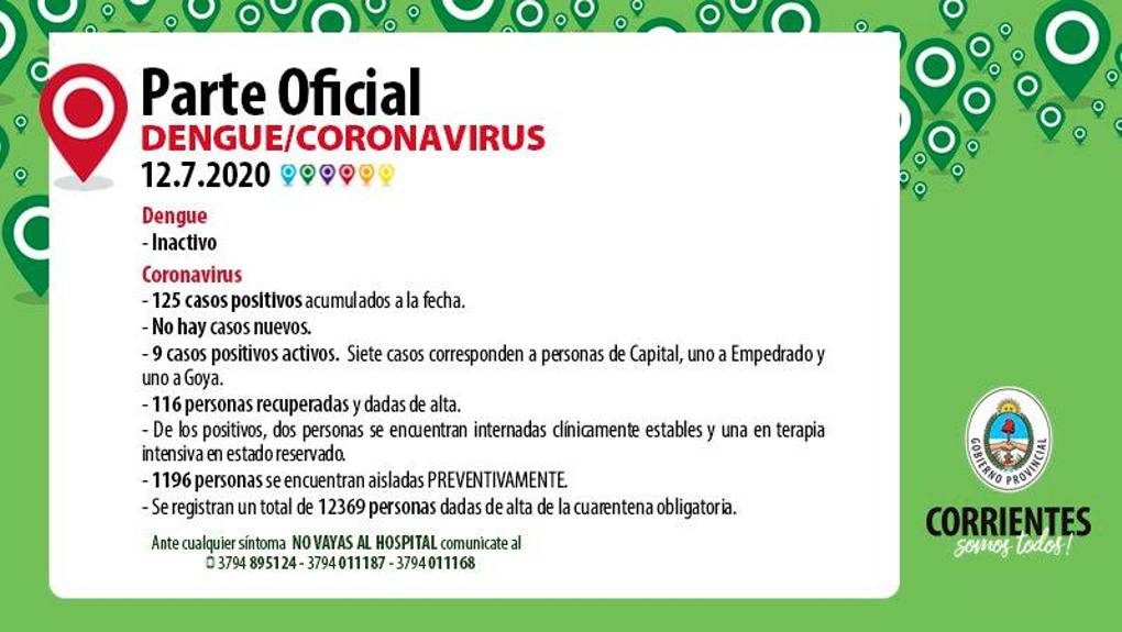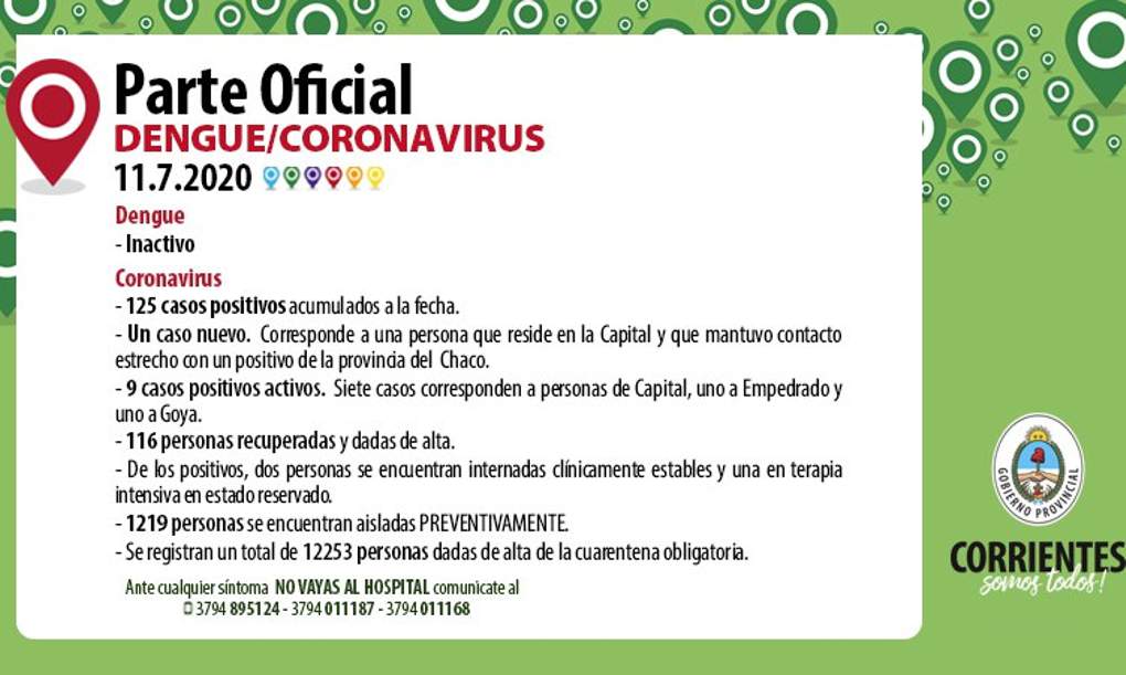 El parte oficial de hoy detalla que se registró un nuevo contagio de Coronavirus, Corresponde a una persona que reside en la capital correntina y mantuvo contacto estrecho con un positivo del Chaco. Se acumulan a la fecha 125 casos positivos de los cuales 9 están activos, 116 personas ya se recuperaron y fueron dados de alta.