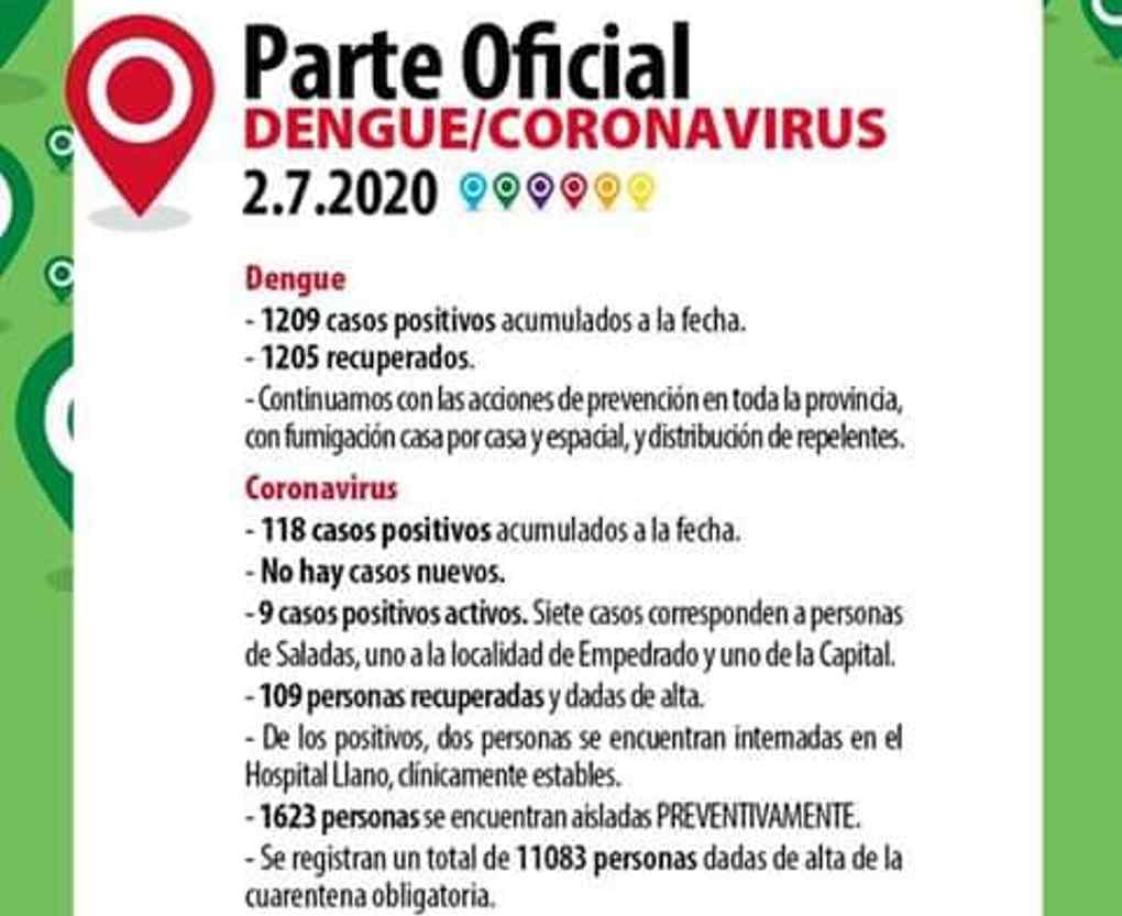 Hay 9 casos activos, siete corresponden a la localidad de Saladas, una de Empedrado y una de la capital correntina, de los positivos dos personas se encuentran internadas en el Hospital Llano, clínicamente estable..