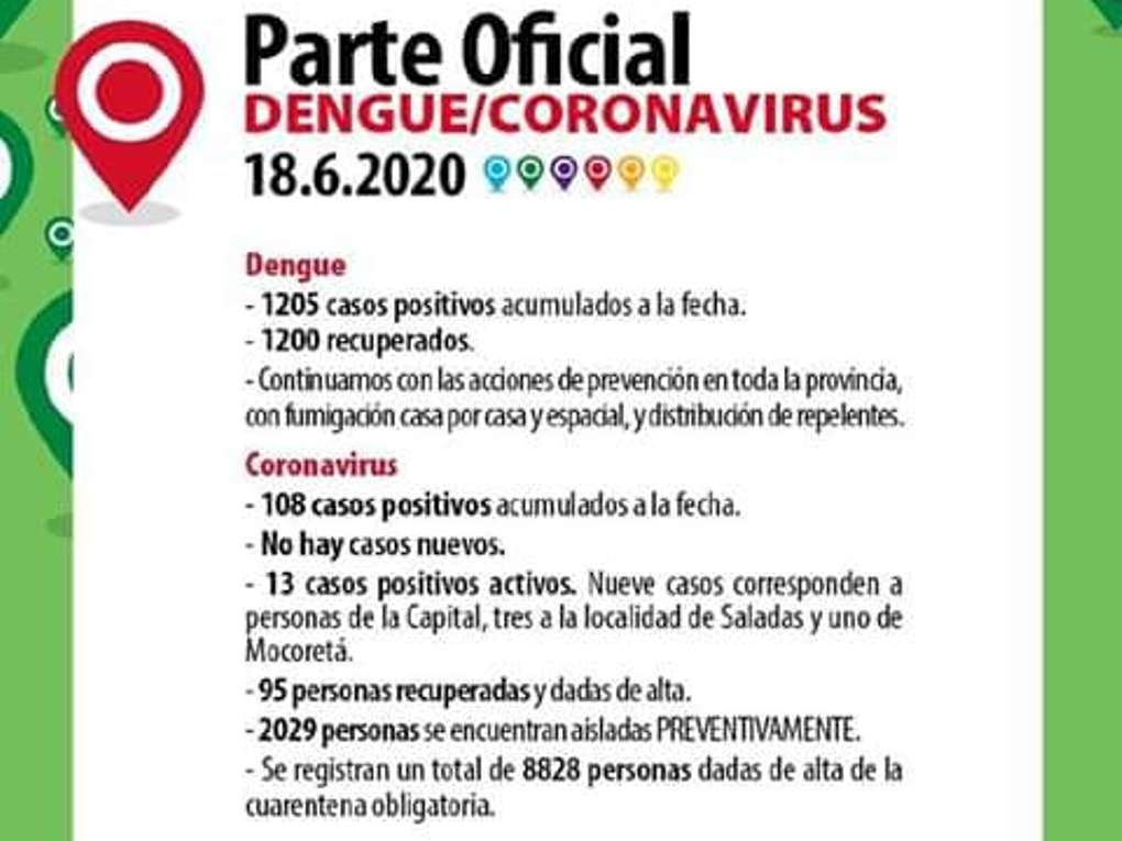 El informe epidemiológico de la Provincia, da cuenta que no hubo nuevos contagios de Covid-19, por lo que el acumulado de positivos se mantiene en 108 casos, de los cuales 95 se han recuperado y fueron dados de alta. Hay trece casos positivos activos, 9 de Capital, tres de Saladas y uno de Mocoretá....