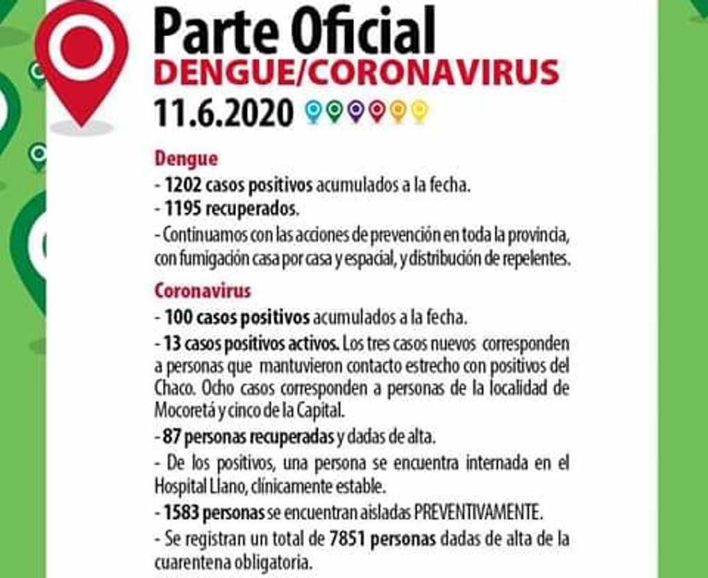 El informe epidemiológico de la provincia de Corrientes indica el registro de tres nuevos caso positivo de Coronavirus en la ciudad de Corrientes, se trata personas que mantuvieron contacto estrecho con positivos del Chaco. De esta manera se acumulan a la fecha 100 casos positivos, de los cuales 87 se han recuperado y fueron dados de alta.