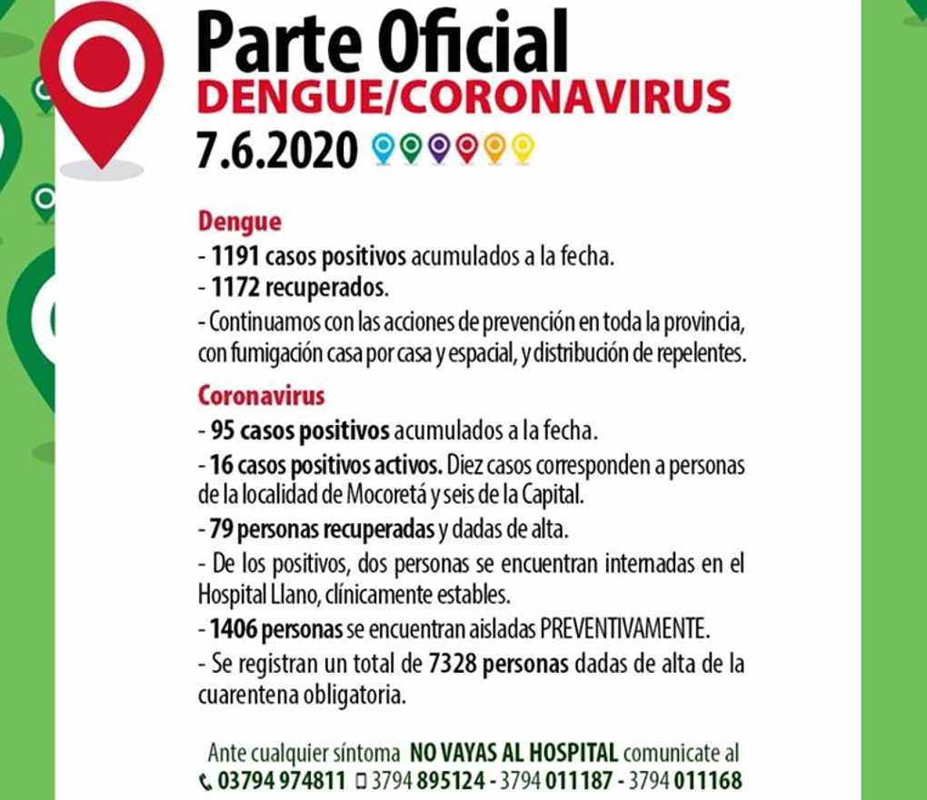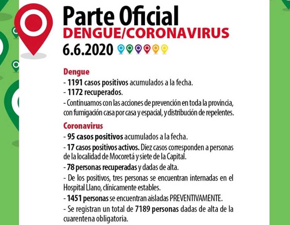 A través del parte oficial emitido por la Dirección del Hospital Samuel W. Robinson se informó el estado epidemiológico de coronavirus/dengue de la ciudad de Monte Caseros correspondiente al día de la fecha: viernes 5 de junio de 2020.