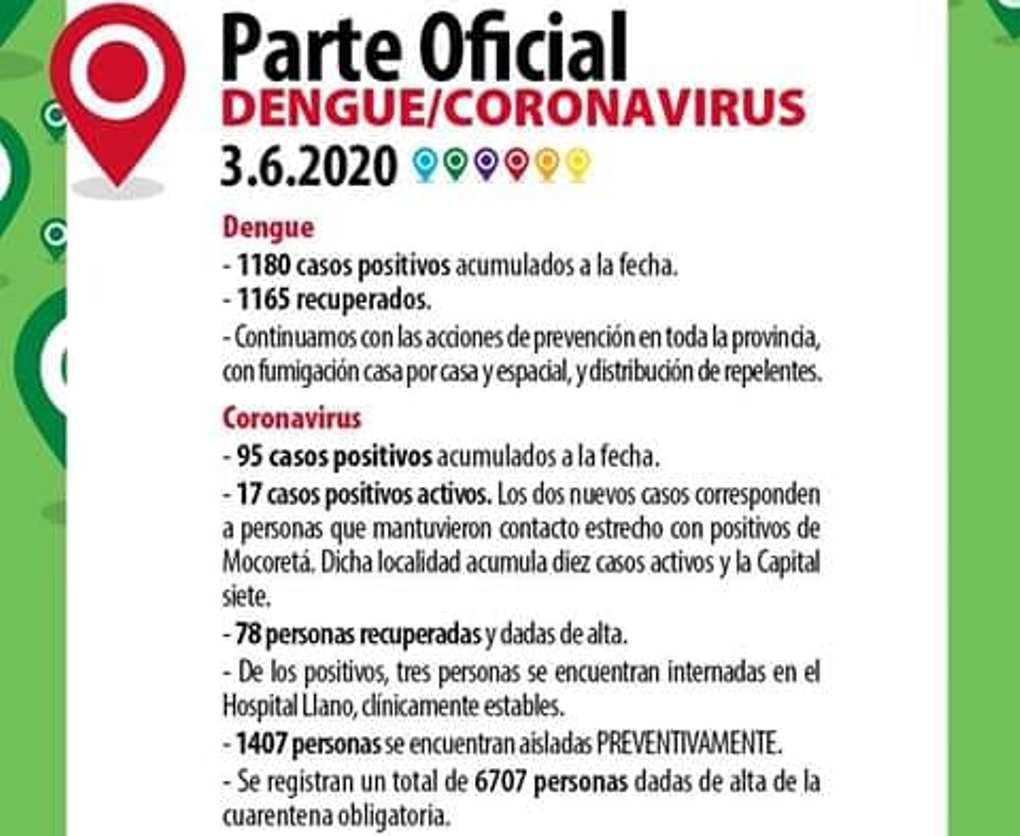 A la fecha se acumulan 95 casos en la provincia, de los cuales 17 se encuentran activos, 10 de ellos son de Mocoretá, todos están en buen estado de salud y cumplen con el aislamiento obligatorio.