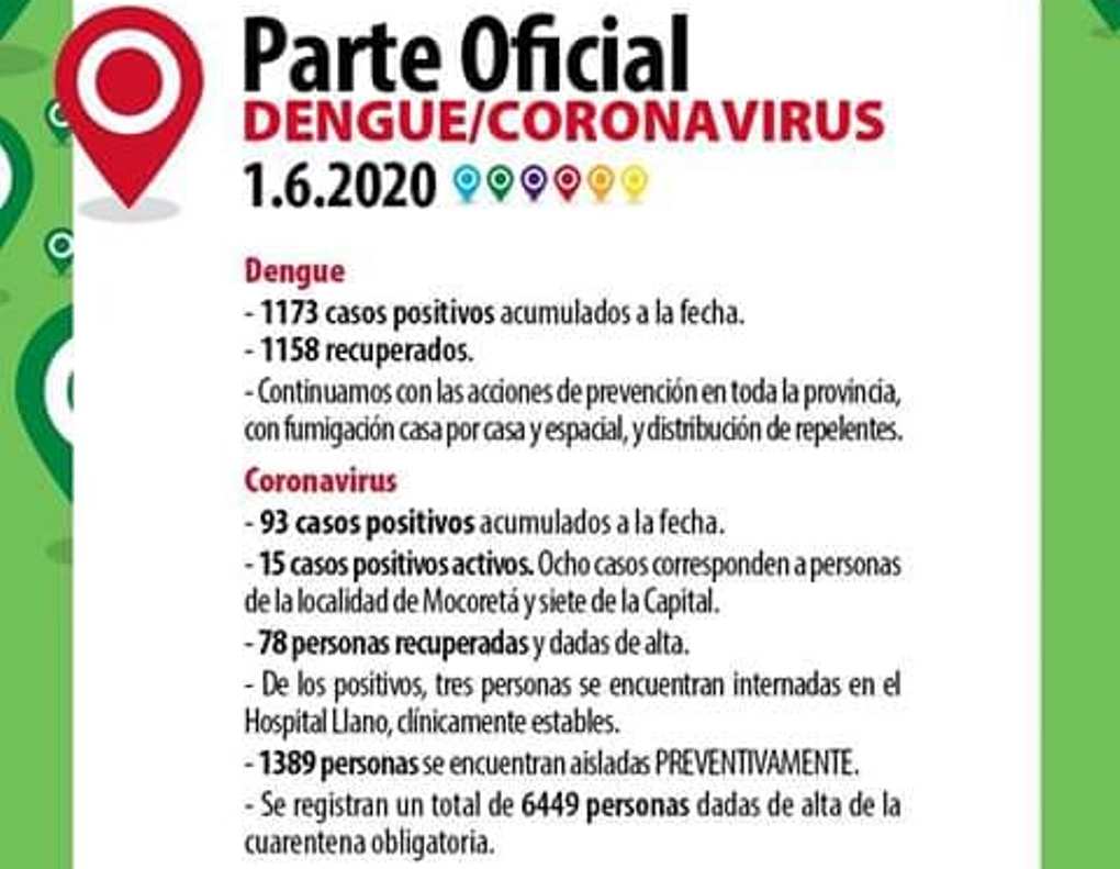 Tras los 6 casos informados en la tarde del domingo la provincia llegó a los 93 positivos de CoVid-19 desde el inicio de los contagios. Pero hay 78 recuperados y sólo 15 son activos, 8 de Mocoretá y 7 en la Capital.